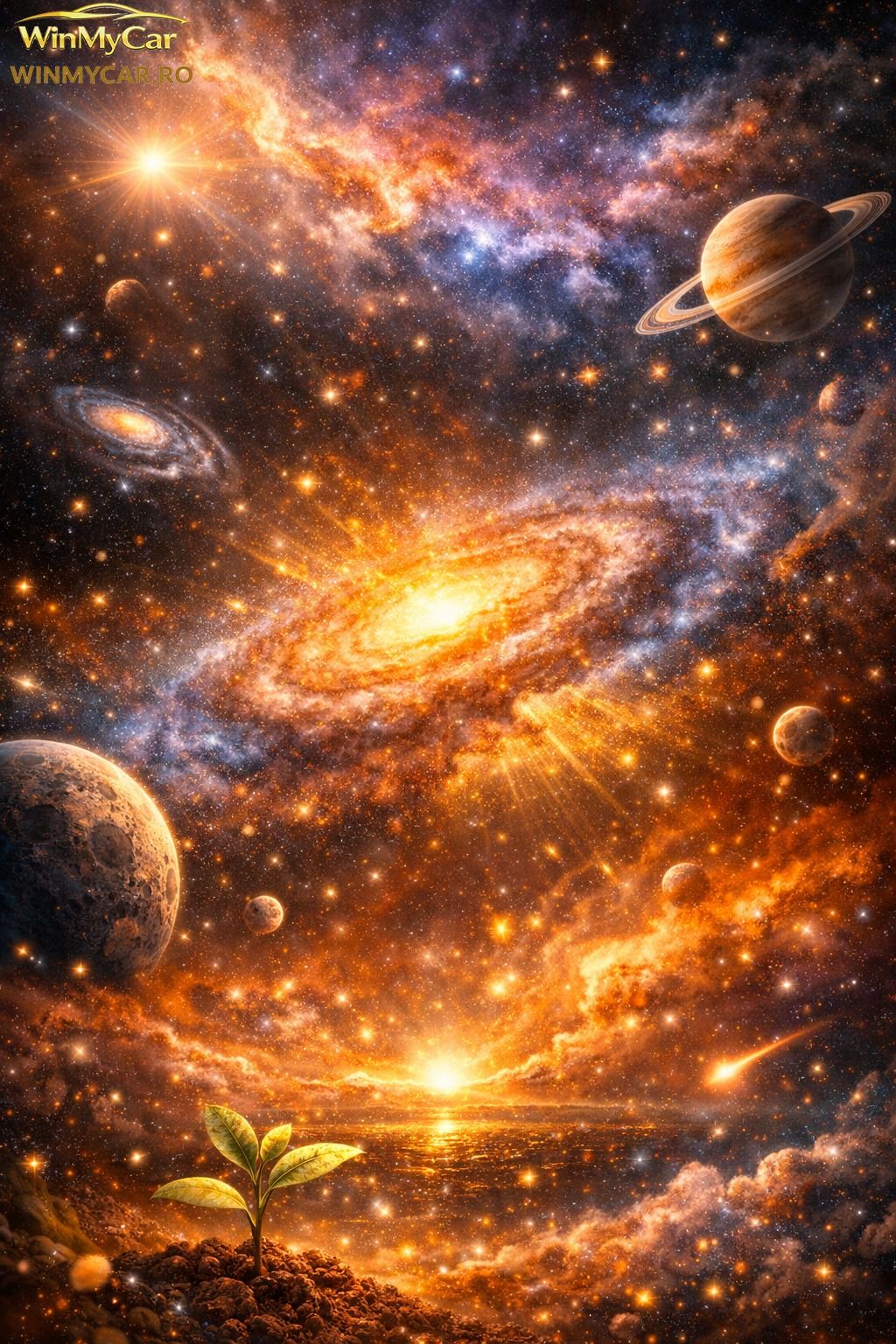 „Puterea Cosmica” este un produs care surprinde intr?o singura imagine forta uriasa a universului si miracolul aparitiei vietii. In centrul scenei se afla o galaxie radianta, inconjurata de stele, nebuloase si planete spectaculoase, creand o atmosfera intensa, plina de lumina si energie. Sub acest spectacol cosmic, o planta tanara rasare din sol, simbolizand inceputul, speranta si legatura profunda dintre cosmos si viata.